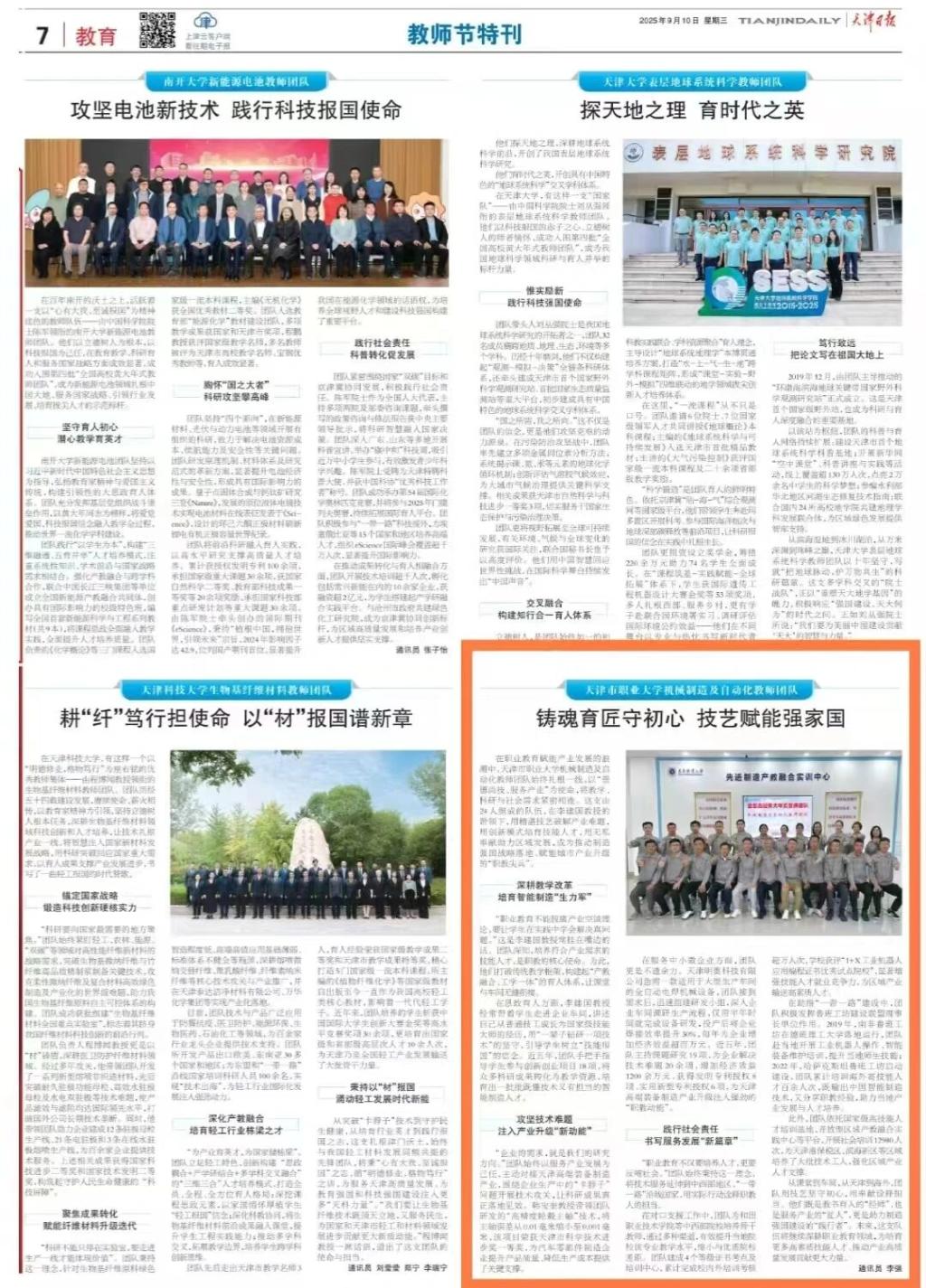 天津日报报道我院“全国高校黄大年式教师团队”